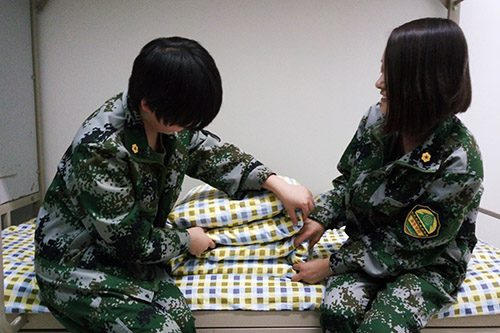 教官主要向学生们传授了叠军被的方法,展示了军营的严苛纪律和铁血精神。他一边演示一边强调折叠的重点,如,被子要压实,用手指大致测量间距并掐出折叠的细缝,抹平被子侧面的褶皱。过程中,大家纷纷对教官的耐心与专业表示敬佩,并表示之后一定会精心营造良好的生活和学习环境。教官向同学们示范了三种不同材质的被子的折法,整整齐齐的豆腐块引来同学们阵阵惊叹。之后,同学们自己动手实践,并不断向教官请教细节之处。