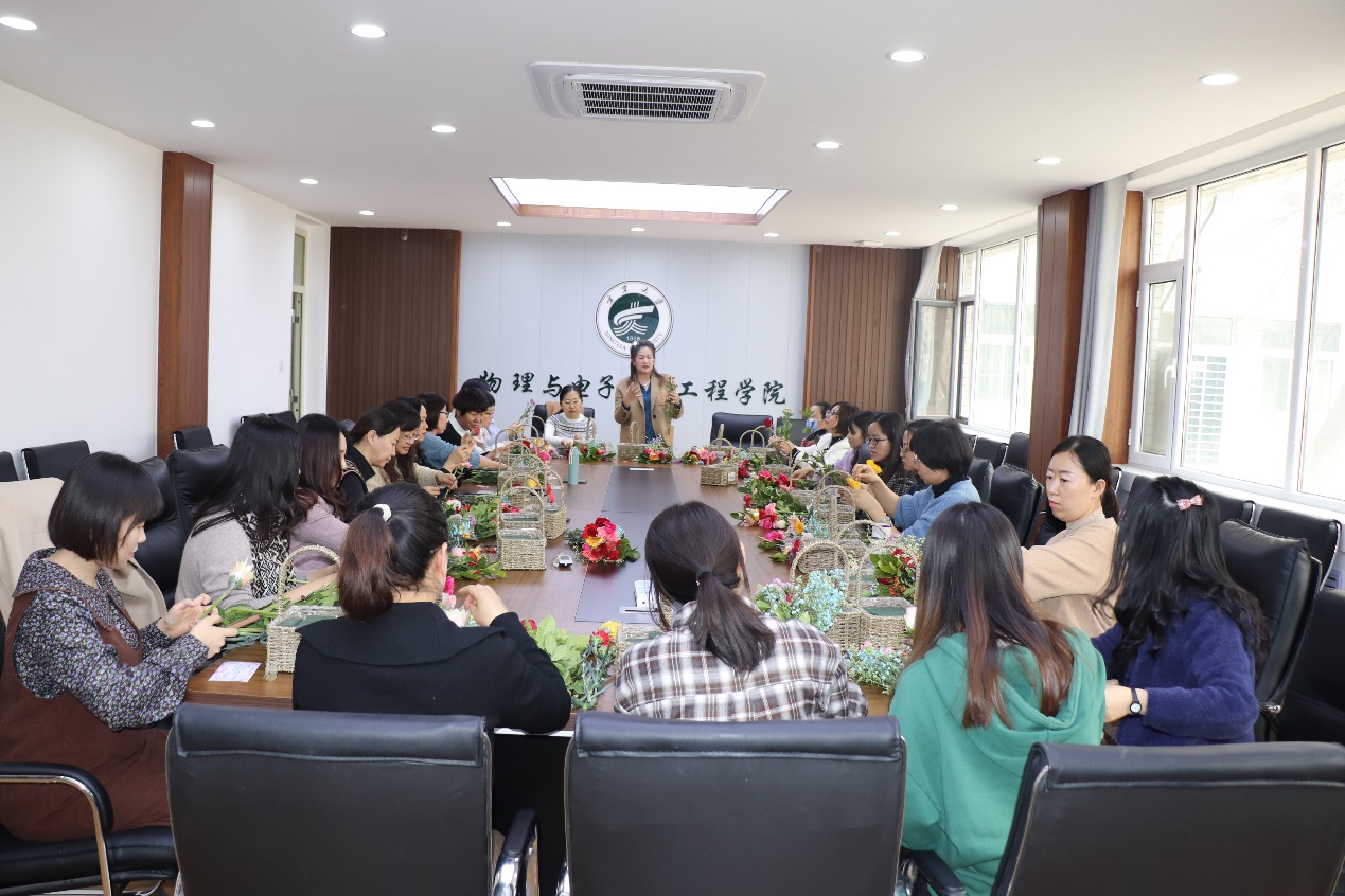 2022年3月8日下午,为温情庆祝第112个国际妇女节,物理与电子电气工程学院分工会特别举办了“以花为名邀您赴一场美丽之约”主题插花艺术礼仪讲座及培训活动。活动由学院分工会女工委员马玲老师主持,银川天地缘花店花艺总监施芳女士主讲,学院全体女教工和部分男教工参加。