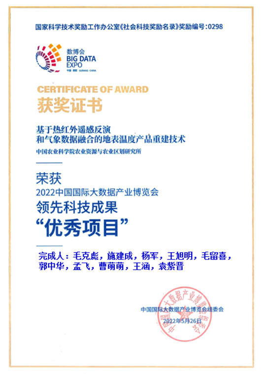 5月26日,2022中国国际大数据产业博览会领先科技成果奖正式揭晓。物理与电子电气工程学院参与中国农业科学院农业资源与农业区划研究所主持的 “基于热红外遥感反演和气象数据融合的地表温度产品重建技术”项目获2022数博会领先科技成果奖“优秀项目”奖项(完成单位:中国农业科学院农业资源与农业区划研究所、成人网站 、国家卫星气象中心、中国科学院国家空间科学中心、国家气象中和山东建筑大学;主要完成人:毛克彪,施建成,杨军,王旭明,毛留喜,郭中华,孟飞,曹萌萌,王涵,袁紫晋等)。