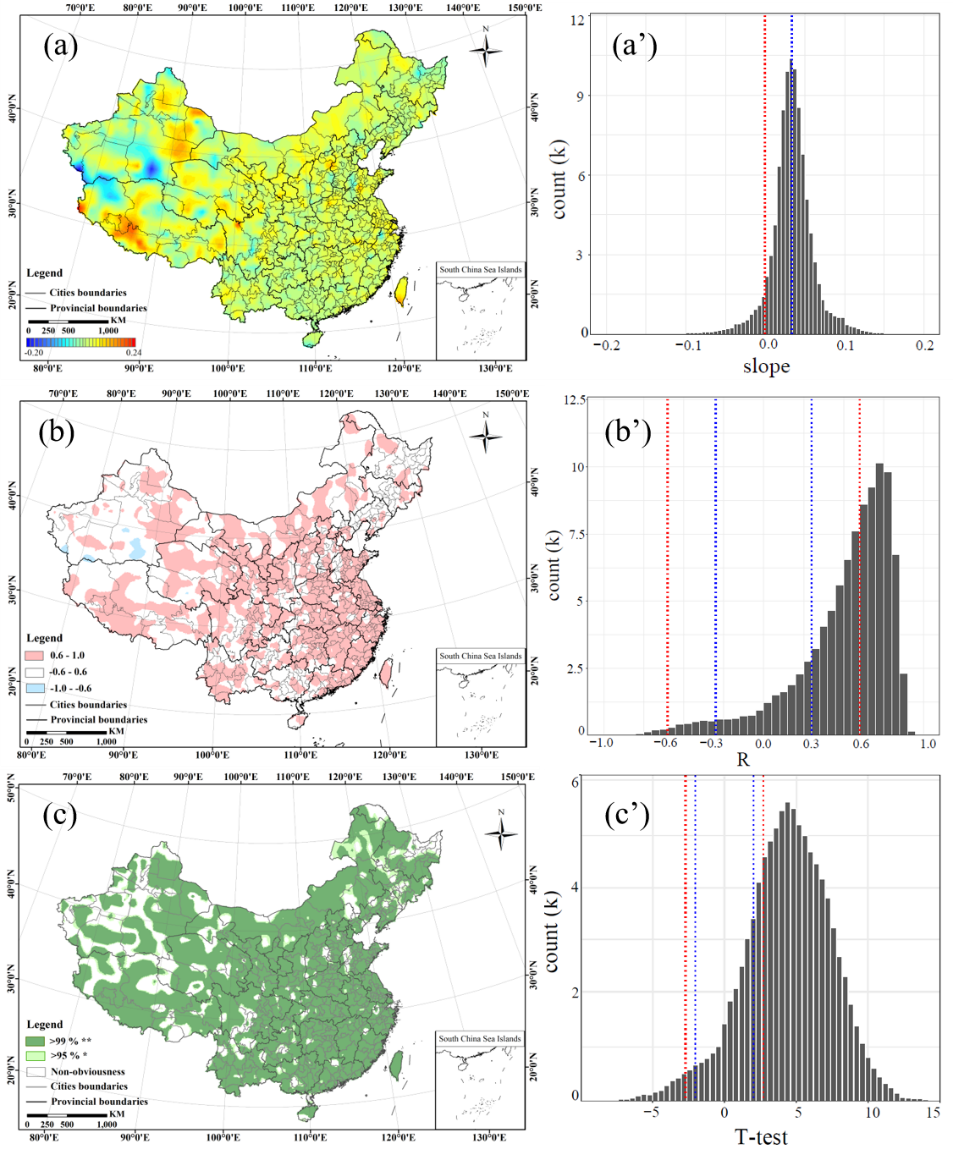 本研究通过构建模型得到日气温数据集。为了进一步验证本产品的精度效果,我们将本数据集与其他数据集进行交叉验证,最终得到较高的精度结果,表明本数据在提升空间分辨率的同时保证了较高的精度。通过对气温进行时空变化趋势分析表明,在本研究时段内中国区域93 %的地区存在升温的趋势,气温平均升高0.03℃/a,这与全球变暖大趋势相一致。鉴于中国区域变暖态势的发展,需要密切关注气温变化趋势,制定政策保障人民的生产生活及维护生态环境稳定。
