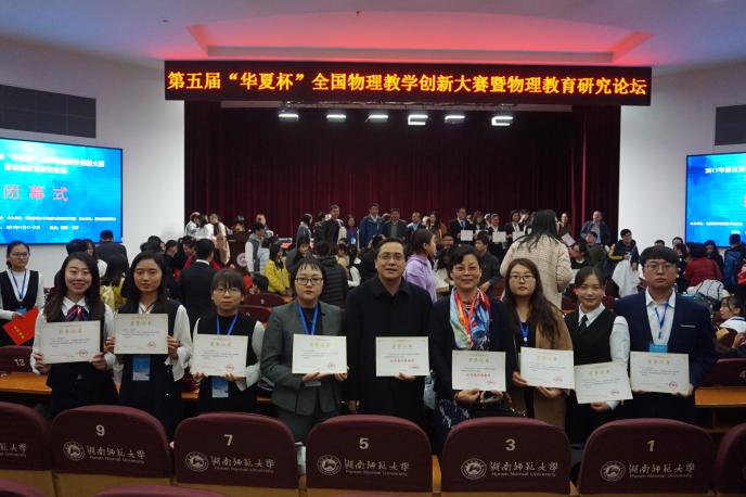 2017年11月20日,由全国高等物理教育研究会主办,湖南师范大学承办,湖南物理学会协办的第五届“华夏杯”全国物理教学创新大赛暨物理教育研究论坛在美丽的长沙落下帷幕,来自华东师大、东北师大、华中师大、西南大学、华南师大、陕西师大、新疆大学、西藏大学等全国47所高校的123位本科生、125位研究生及来自北京、重庆、贵州、湖北、福建、新疆等15个省市的一线中学物理教师38人参加本次比赛,出席活动代表共计400余人。在群英荟萃、高手云集的比赛中,我院参赛选手取得一个一等奖、四个二等奖、两个三等奖的好成绩。