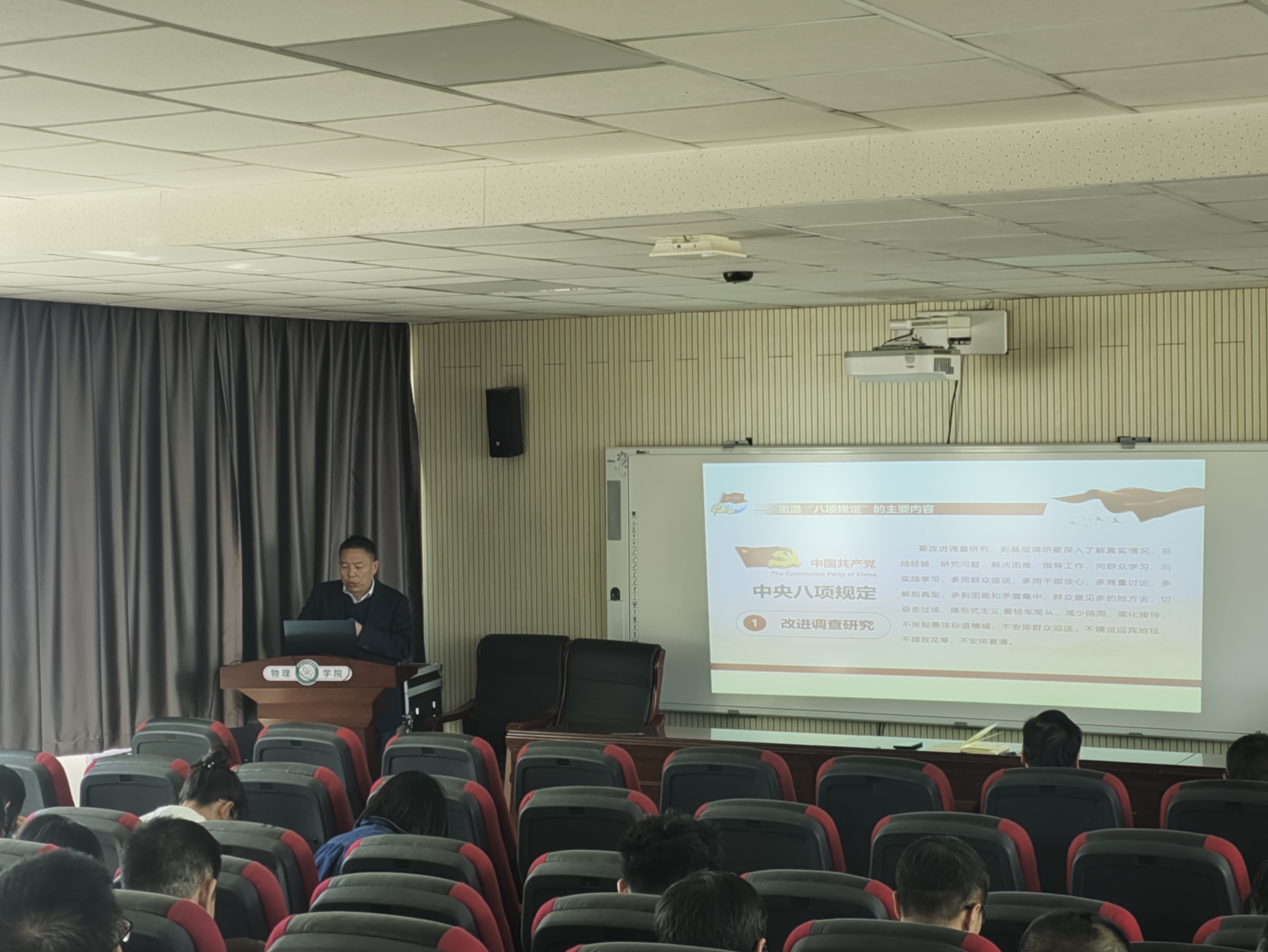 为深入贯彻落实全面从严治党要求,进一步增强全院教师的纪律意识和规矩意识,2025年4月9日,我院在博远楼321会议室召开全院教师大会,学院党总支书记王恒以“深入贯彻中央八项规定精神学习教育-推动党的作风持续向好”为主题,为全体教师上了一堂生动而深刻的党课。王恒书记从中央八项规定出台的背景、主要内容以及重大意义展开讲解,结合近年来高校领域违反中央八项规定精神的典型案例,引导广大教师深刻认识到作风建设永远在路上,必须时刻绷紧廉洁自律这根弦。他强调,全体教职工要提高政治站位,深刻领会中央八项规定精神的实质内涵,自觉把思想和行动统一到党中央的决策部署上来;要坚持以身作则,严格遵守各项纪律规定,做到心有所畏、言有所戒、行有所止;要切实转变工作作风,增强服务意识,提高工作效率,以良好的精神状态和扎实的工作作风推动学院各项事业高质量发展。此次党课内容丰富、案例详实,具有很强的针对性和教育性。大家纷纷表示,将以此次党课学习为契机,加强自身的党性修养和纪律意识,严格遵守中央八项规定精神,在今后的工作中坚守底线、不碰红线,努力营造风清气正的教育教学环境